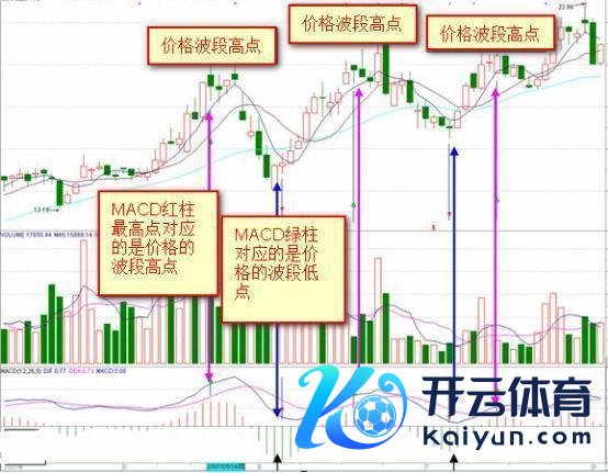 价钱上升,MACD红柱渐渐放大,当红柱出现最高点时(最长红柱),价钱也通常对应出现波段高点。(背离时不会对应)