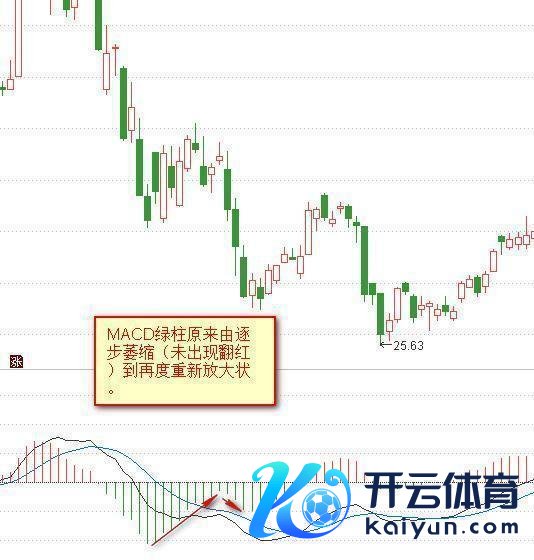 在实践中,MACD绿柱不错连气儿出现两波以致三波连气儿性翻绿,这是价钱弱势连气儿着落的效果。操作上咱们必须小心这么的走势。在价钱出现止跌小幅反弹或颠簸再再行着落时,MACD绿柱原来由渐渐萎缩(未出现翻红)到又再行放大,这是一个卖出信号。价钱将进一步着落,之前的买入操作必须止损。