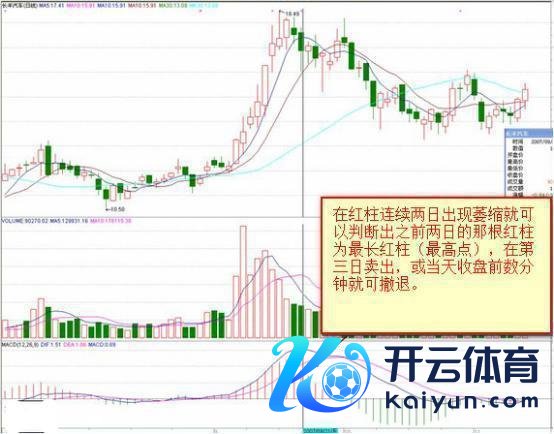 不异,当红柱最高点时,在自后的第三日或当日的收盘前或后头的股票放量阴线时卖出。或MACD红柱出现最高点时, 日K线同期出现十字星或阴线时是很好的卖出契机。这时卖出会比到红柱缩小到翻绿时卖出更能卖到更高的价钱。